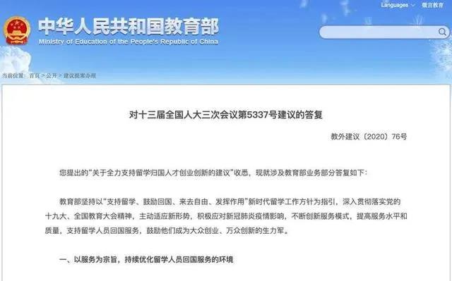 教育部堅持以“支持留學、鼓勵回國、來去自由、發揮作用”新時代留學工作方針為指引,積極應對新冠肺炎疫情影響,不斷創新服務模式,提高服務水平和質量,支持留學人員回國服務,鼓勵他們成為大眾創業、萬眾創新的生力軍。