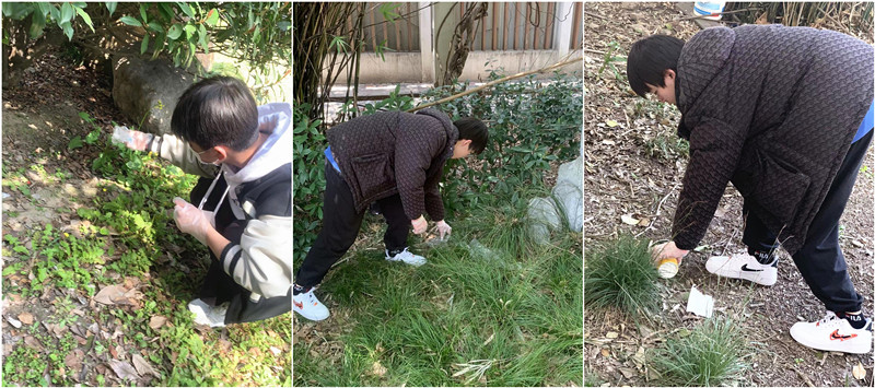 我們先來到了校園的小樹林,這里景色宜人,金色的陽光透過嫩綠的新葉照射下來,綠意澄澈到心底。綠蔭下的涼亭給校園增添了幾分詩情畫意,還有幾只貓懶洋洋地臥在柔軟的草叢中休息。在溫暖的春日暖陽下,我們撿拾起了少許的紙團和塑料空瓶,用干凈的抹布擦去亭子上的塵土,令它露出了鮮亮的本色。打掃完后,同學們仔細地檢查,確認完全收拾整潔后才前往下一個地點。