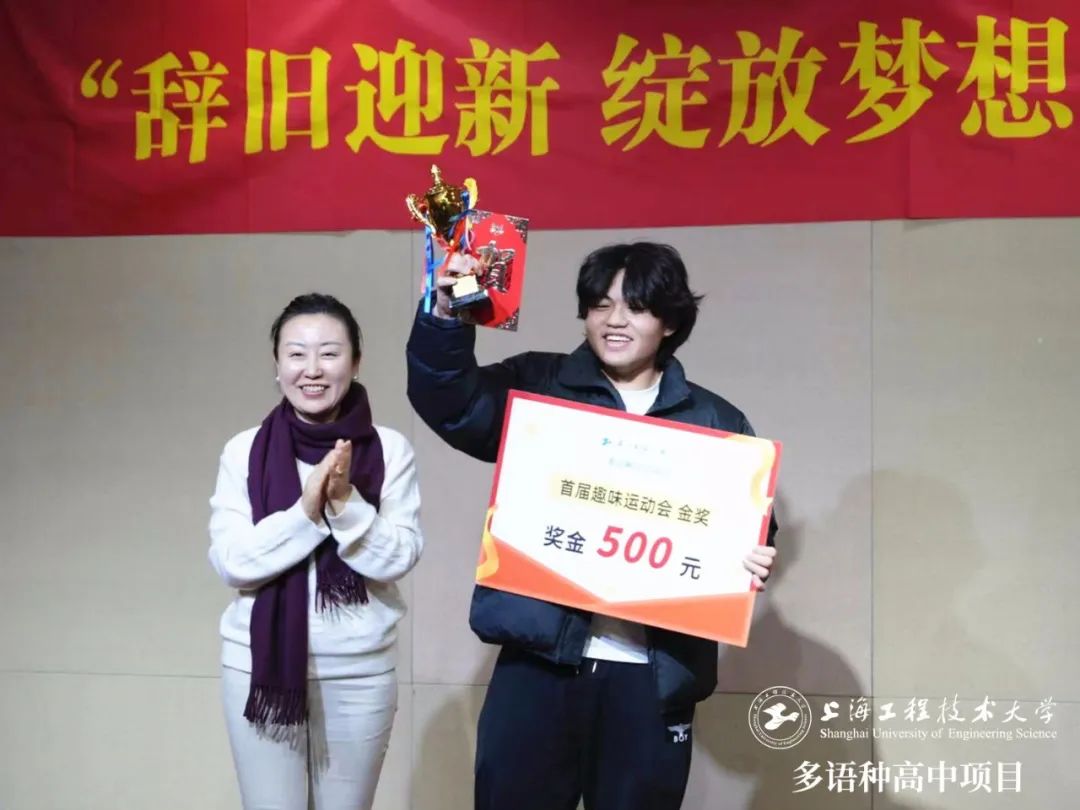 優秀社團表彰之后,是為在趣味運動會取得優異成績的班級進行頒獎。隨著22-1班的體育委員房邦國同學從葉宇宏老師手中接過金燦燦的獎杯并高高舉起,會場的氣氛瞬間熱烈起來。