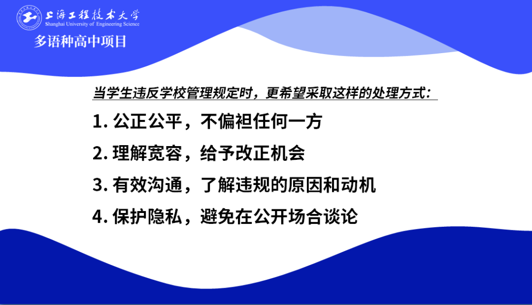 葉茗小組分析了學生配合學校管理規定的重要性,并針對如何更好地遵守校紀校規提出相應的建議。這一組的展示還分析了出現違反學校管理規定的情況時,學生希望學校采取的處理方式應當注重公平公正、理解寬容、有效溝通和保護隱私。