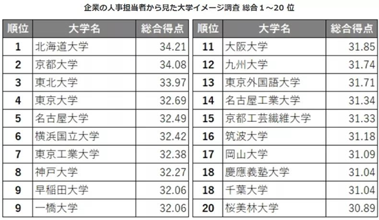 這是日經(jīng)HR發(fā)布的「企業(yè)人事負責人眼中的大學形象調查」結果,調查實施的時間為2021年2月15日~3月22日,調查對象為4850所公司,最終有834所公司參與回答,然后根據(jù)回答選出了前20名。