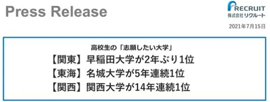 根據今年的調查數據,關東地區的早稻田大學時隔2年重回榜首;東海地區的名城大學連續5年占據榜首,關西地區的榜首還是被關西大學獨霸14年。