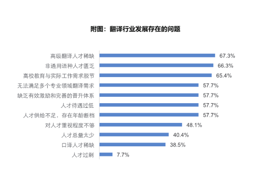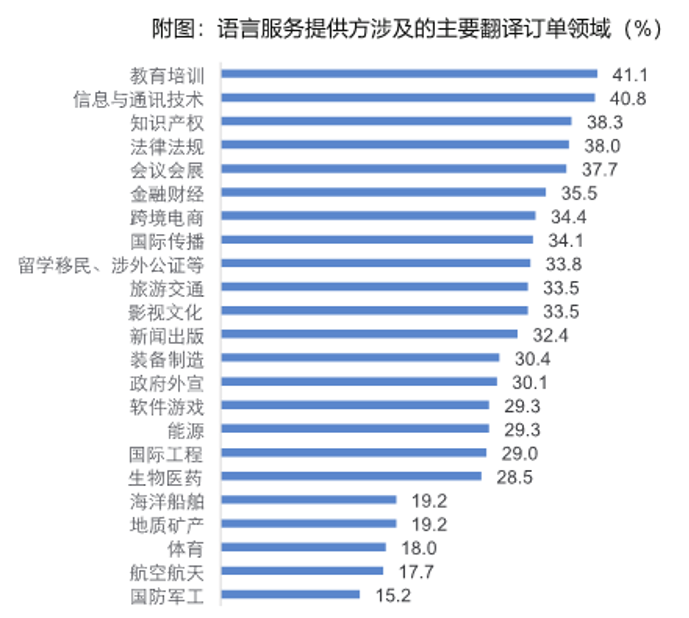 隨著翻譯領域和內容的日益多樣化,翻譯人才隊伍發展對各領域起到了重要支撐作用。其中,教育培訓、信息與通訊技術、知識產權是最主要的翻譯業務領域,分別占了41.1%、40.8%、38.3%。