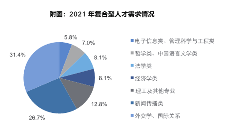 從近五年趨勢來看,復合型人才需求占了多數,學科融合發展成為必然趨勢,對掌握相關語種和其他專業知識的復合型人才的需求迫切。