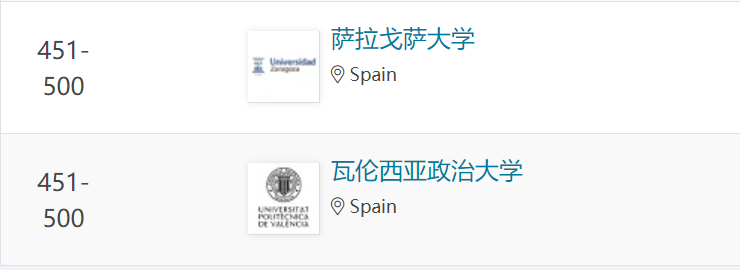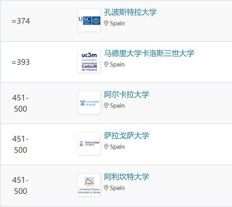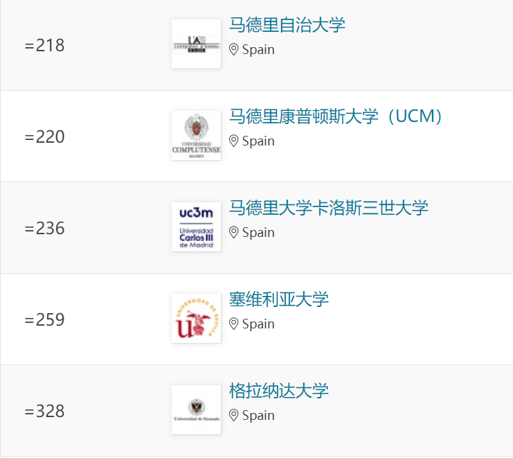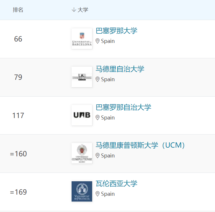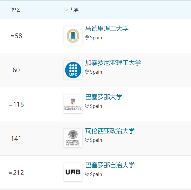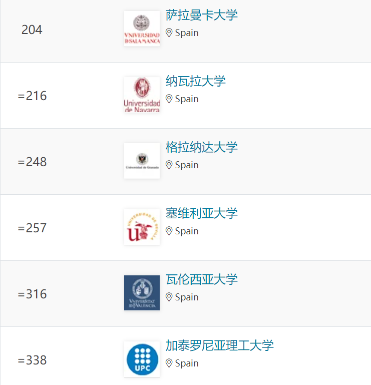 納瓦拉大學、龐培法布拉大學、拉曼·魯爾大學、卡洛斯三世大學和巴塞羅那自治大學躋身世界百強之列。
