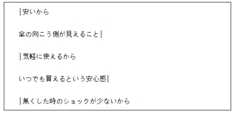 日本也曾做過調(diào)查,統(tǒng)計(jì)大家喜歡透明長傘的主要理由,包括:價(jià)格便宜;能夠透過傘看到天空;使用方便;不管什么時(shí)候都能買到的安心感;丟失也不會很驚訝。
