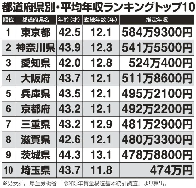 在日本各個都道府縣中平均年收排名中,排在第一的是東京都,接下來是神奈川縣、愛知縣。