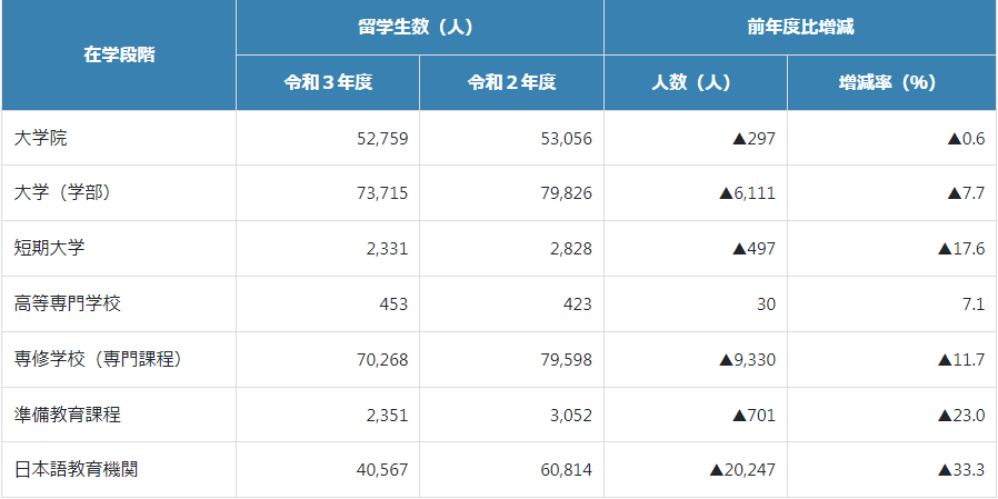 這份調(diào)查每年都會(huì)發(fā)布一次,統(tǒng)計(jì)對(duì)象包括大學(xué)(含大學(xué)院)、短期大學(xué)、高等專門學(xué)校,專修學(xué)校、為進(jìn)入日本大學(xué)而設(shè)置的教育設(shè)施以及日語(yǔ)教育機(jī)關(guān)等的在籍外國(guó)人留學(xué)生。