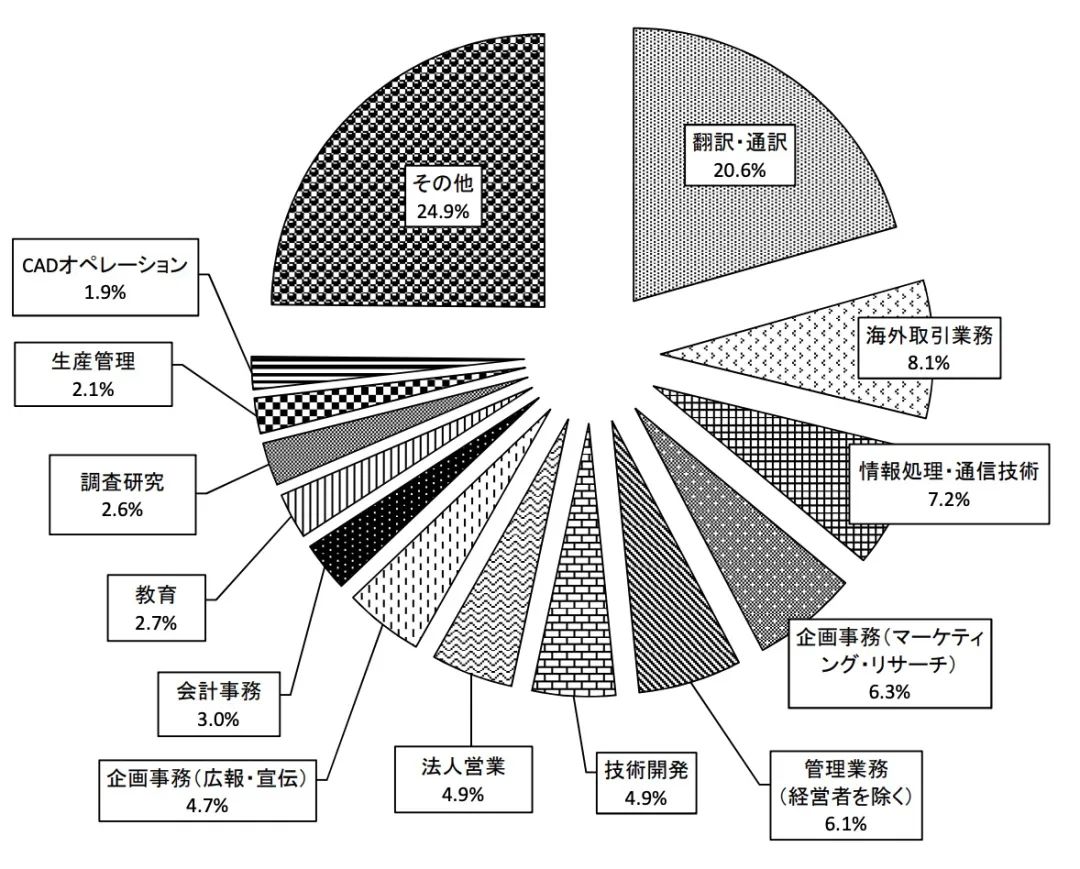 這些工作簽證在申報(bào)時(shí)所填的具體從事的業(yè)務(wù)內(nèi)容是什么?主要工作內(nèi)容為翻譯口譯的占到了20.6%(一般不會(huì)只做翻譯工作),人數(shù)為最多。其次是涉及海外國(guó)際業(yè)務(wù)的占8.1%,情報(bào)處理和通信技術(shù)(IT相關(guān)產(chǎn)業(yè))的占7.2%。