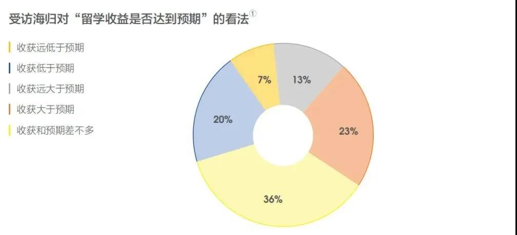 受訪海歸中近四分之三的人對“留學(xué)收益是否達到您的預(yù)期”持肯定態(tài)度。其中“收獲和預(yù)期差不多”、“收獲大于預(yù)期”、收獲遠大于預(yù)期”分別占比36%、 23%、13%。