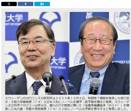 2025年10月6日至8日,日本科學(xué)家坂口志文(大阪大學(xué))和北川進(jìn)(京都大學(xué))分別獲得諾貝爾生理學(xué)或醫(yī)學(xué)獎(jiǎng)、化學(xué)獎(jiǎng),實(shí)現(xiàn)3天內(nèi)連獲兩項(xiàng)諾獎(jiǎng)的突破。