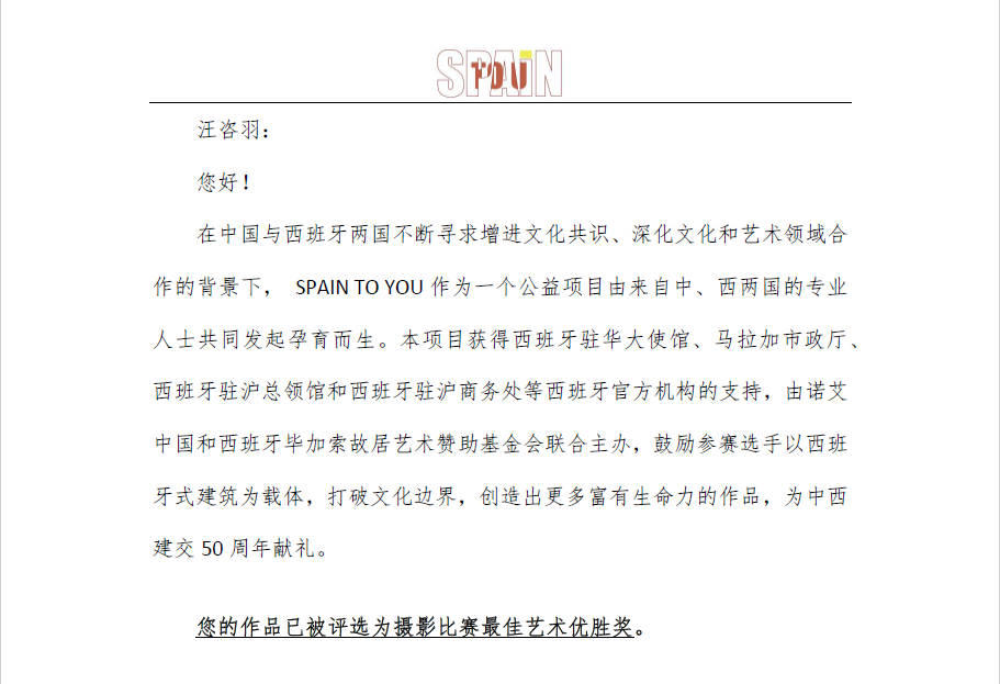 很高興參加了這次SPAIN TO YOU 2023藝術比賽且在建筑攝影單元獲得了獎項。